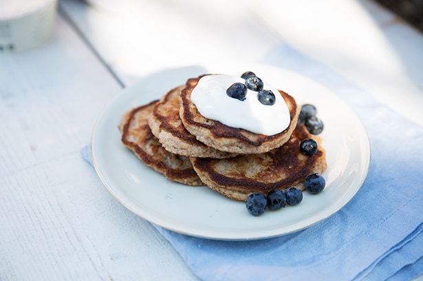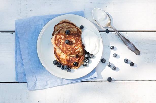 - Die Pancakes mit Joghurt und ein paar Beeren servieren.