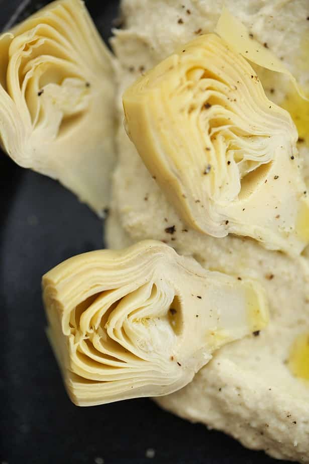 Du kannst den Dipp auch aus frischen Artischocken zubereiten. Dafür brauchst Du allerdings schon mindestens 5 Artischocken. Dafür die Artischocken putzen, die Stiele abschneiden, die äußeren harten Blätter bis zu den hellen Innenblättern großzügig abzupfen und die obere Hälfte abschneiden. Artischocken vierteln, das Heu mit einem Teelöffel herauskratzen. Dann die Artischocken im Salzwasser ca. 20 bis 30 Minuten kochen, bis sie weich sind. Dann weiter wie im Rezept.