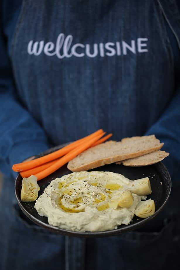 Auf Mallorca ist zur Zeit Artischocken-Saison und man bekommt sie auf jedem Markt quasi hinterhergeworfen. Seit meinem letzten Artischockenbeitrag weiß ich allerdings, dass das nicht bedeutet, dass man auch in Deutschland, Österreich und der Schweiz plötzlich überall Artischocken bekommt. Ein paar Leute wollten nämlich gerne das Rezept ausprobieren, konnten aber nirgends eine Artischocke auftreiben. Später im Jahr sprach mich eine Teilnehmerin unseres Retreats darauf an, ob ich eine Idee hätte, was man mit Artischocken im Glas anstellen könnte. Und so entstand dieser unkomplizierte Dipp auf Grundlage eingelegter Artischocken, die man wirklich überall kaufen kann. Er schmeckt zu Rohkost, Ofengemüse oder einer Scheibe Brot ganz wunderbar und bringt den angenehm bitteren Geschmack der Artischocke super zur Geltung. Da er so schnell und gesund ist, ist er für mich eins dieser Basiscs, die ich rasch aus dem Ärmel schütteln kann, wenn ich nicht viel Zeit habe.
