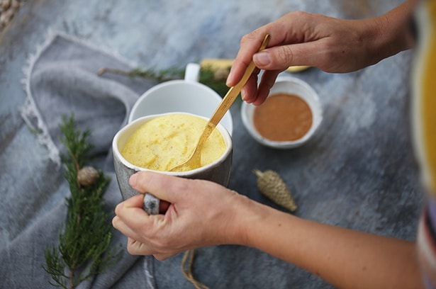 Letztes Wochenende waren Thomas und ich auf einem kleinen, netten Weihnachtsmarkt auf einer Finca mitten auf dem Land von Mallorca. Dort roch es nach Lagerfeuer, kleine Kinder krähten Weihnachtslieder in ein Karaoke-Mikrophon, und zwischen Bäumen und Farnen bewegten sich Menschen in Blumenkleidern und kauften Blumenseifen, Blumenschmuck, Blumensandwiches und Blumen eingelegt in Öl. An einem Stand gab es Getränkepulver mit Superfoods in allen Farben von Pink bis Schwarz. Ich weiß nicht, ob ich Ärger bekomme, wenn ich verrate, dass mein Mann an jenem Nachmittag mit großer Begeisterung ein blaues Getränkepulver kaufte, das eine normale Pflanzenmilch wie Einhornpipi aussehen lässt. Aber als der nette Verkäufer mit dezenter Anspielung auf Thomas Radrennjacke erwähnte, dass das Pulver ideal für Radsportler sei und den Muskelaufbau begünstige, konnte er einfach nicht anders. Als er kurz davor war, auch noch Golden-Milk-Pulver zu kaufen, das ungefähr so teuer war wie ein klitzekleiner Barren Gold, flüsterte ich ihm zu: „das kann ich auch selber machen“. Also musste ich Wort halten. Und so stand ich zwei Tage später in der Küche und rührte Gewürze und Honig für einen Golden Milk-Konzentrat zusammen, den man dann nur noch mit heißer Mandelmilch verrühren muss, um in Nullkommanichts eine leckere Golden Milk oder Kurkuma-Latte zu erhalten.