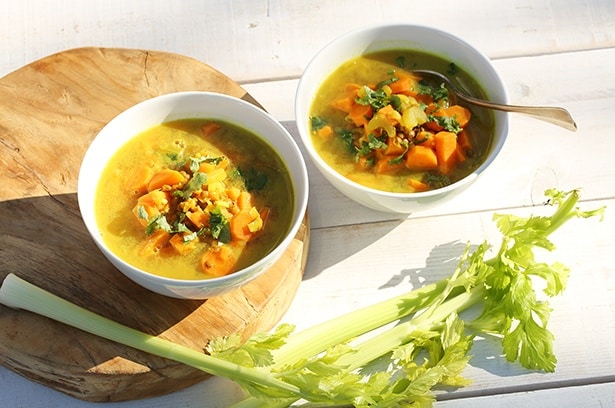 Am Anfang des Jahres esse ich gerne einfache, ausgleichende und wärmende Gerichte. Im Dezember haben wir alle ein bisschen zu viel gegessen und getrunken, da haben Körper und Geist im Januar Lust auf Reinigung. Deshalb gibt es jetzt eine Suppe, die den Körper sanft entgiftet und ihn mit allem versorgt, was er jetzt braucht: Wärme, Vitalstoffe und Futter fürs Immunsystem. Für mich ist diese Suppe Medizin, nur eben eine wohlschmeckende. Sie ist gepackt voll mit Heilmitteln aus der Natur: Kurkuma, einem starken Antioxidanz, Knoblauch und Ingwer als Entzündungshemmer, Beta-Carotin zur Stärkung des Immunsystems und Linsen zur Pflege des Darms. Du könntest sogar eine kleine Detox-Kur machen, bei der die Suppe fester Bestandteil ist. Sie passt gut in den Januar oder ins Frühjahr und hilft uns, das Jahr gesünder, ausgeglichener und bewusster zu starten. Du brauchst nur drei Tage Zeit (zum Beispiel Samstag bis Montag), ein wenig Ruhe und schon bist Du mittendrin in Deinem persönlichen Wellness-Retreat. Und so gehts: