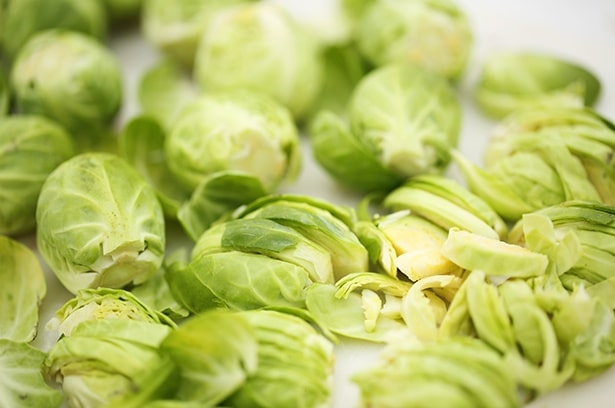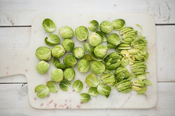 - Die Strünke des Rosenkohls abschneiden und gelbe oder braune äußere Blättchen entfernen. 4–6 schöne, grüne Blättchen für die Deko zurücklegen. Jeden Rosenkohl längs in Hälften schneiden und jede Hälfte in Scheiben schneiden (je Hälfte ca. 5 Scheiben).