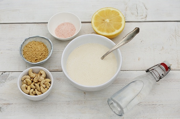 Auf dem Bild oben siehst Du die pflanzliche Sahne (in der Mitte) mit ihren Zutaten: Cashewkerne, Nährhefe, (Himalaya-)Salz, Zitronensaft und Wasser.