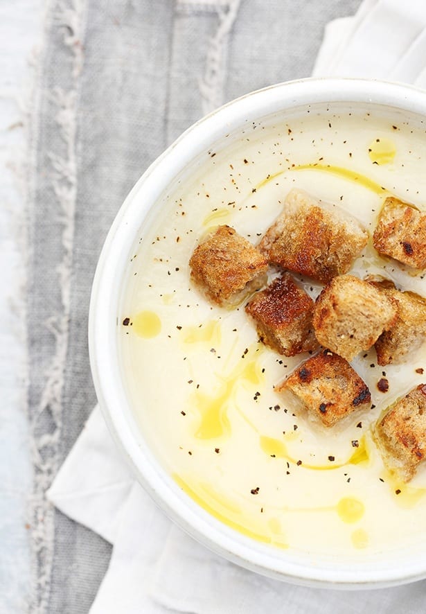 Cremesuppen serviere ich gerne mit einem Topping, denn ich finde, dass sie sonst schnell langweilig werden können. Gaumen und Mund möchten schließlich auch ein bisschen unterhalten werden und zwischendurch einen anderen Geschmack oder eine unterschiedliche Konsistenz haben. Zur Selleriesuppe passt ein mit Zitronenöl aromatisiertes Olivenöl, das den feinen Geschmack der Wurzel unterstreicht. Dazu ein paar selbstgemachte Croutons, damit die Suppe noch ein bisschen herzhafter wird. Und fertig ist die beste Medizin, die Du je gegessen hast!