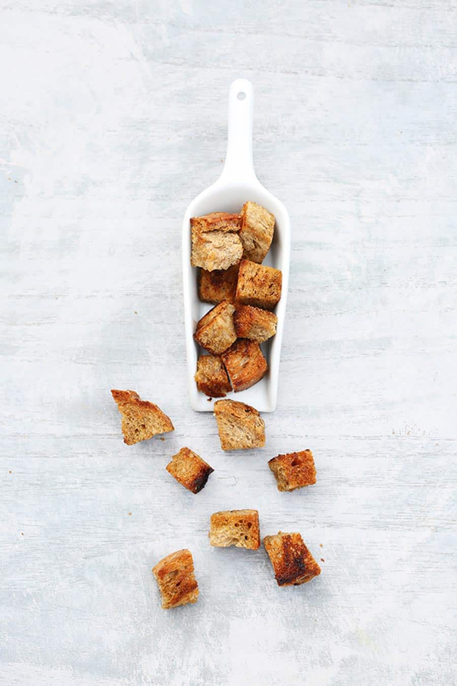 - 4 Scheiben Brot zum Beispiel Roggen, Dinkel oder glutenfreies Brot, klein gewürfelt