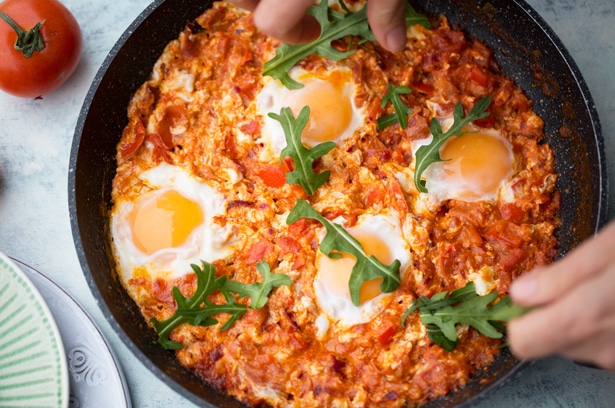 - Die Shakshuka vorsichtig – ohne das Eigelb zu verletzen – auf zwei Tellern verteilen. Bei Bedarf mit etwas Rucola anrichten und sofort servieren.