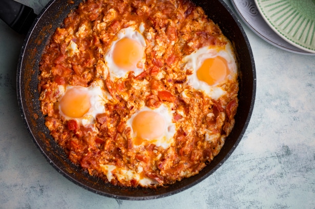 - Die Eier am Pfannenrand aufschlagen und vorsichtig nacheinander in die Sauce gleiten lassen. Das Eigelb sollte ganz bleiben. Mit dem Ende eines hölzernen Kochlöffels das Eiweiß in kreisenden Bewegungen (die liegende Acht) mit der Tomatensauce verrühren, das Eigelb dabei nicht berühren. Die Pfanne abdecken und ca. 3–4 Minuten warten, bis das Eigelb nicht mehr glasig ist. Aufpassen, dass das Eigelb nicht weiß überzieht und fest wird. Es sollte weich bleiben wie bei einem Spiegelei.