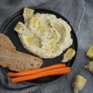 Die Artischockenherzen mit Tahini, Zitronensaft, Olivenöl, Knoblauch, Salz und Pfeffer im Häcksler pürieren.