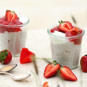 In zwei kleinen Gläsern zuerst den Chiapudding einfüllen und mit der Erdbeermarmelade bedecken. Wer mag, fügt noch je 1 EL Naturjoghurt hinzu.