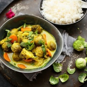 Eine große und tiefe Pfanne oder einen Topf erhitzen. Olivenöl hinein geben und Brokkoli, Rosenkohl und Karotten unter Rühren 2 Minuten leicht anbraten. Mit Kokosmilch und Wasser ablöschen und die grüne Currypaste hinzufügen. Bei mittlerer Hitze und geschlossenem Deckel ca. 15 Minuten köcheln lassen, bis der Rosenkohl bissfest ist. Mit Salz und Zitronensaft abschmecken.