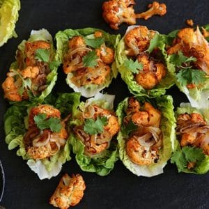 Jeweils 4 Mini-Romanasalatblätter auf einen Teller legen, mit Guacamole bestreichen und mit Blumenkohl-"Wings" belegen, mit Zwiebelringen und Koriander garnieren und sofort servieren. Die restlichen Blumenkohl-"Wings" nehme ich gern mitsamt dem Backpapier vom Blech und gebe alles in eine große Schüssel, die ich auf den Tisch stelle und aus der man sich direkt bedienen kann.