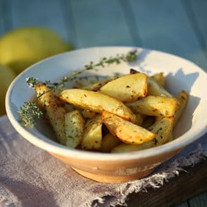 Ein Backblech mit Backpapier auslegen und die Kartoffeln mitsamt Flüssigkeit gleichmäßig darauf verteilen. 30 Minuten auf mittlerer Stufe backen. Den Ofen auf Umluft und Oberhitze umschalten und weitere 20–30 Minuten backen, bis die Kartoffelspalten gebräunt und knusprig sind.